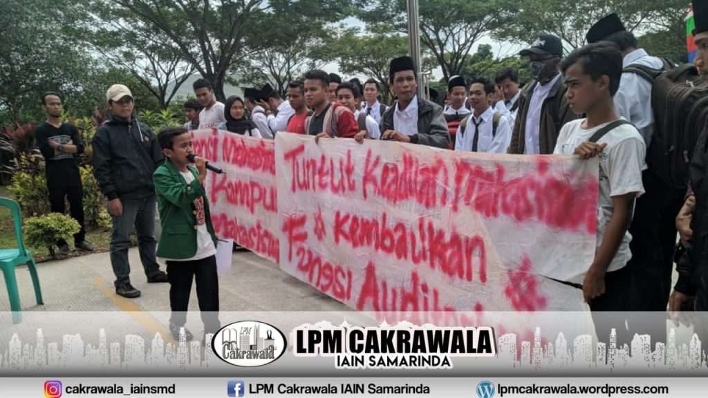 Samarinda, LPM Cakrawala – Ratusan mahasiswa yang terhimpun dalam Aliansi Mahasiswa Peduli Kampus padati halaman belakang Rektorat, Sabtu (17/8) menuntut legalitas penyewaan Auditorium A.M Sultan Sulaiman yang kurang berimbang dan dinilai tidak sesuai dengan Standar Operasional Prosedur (SOP).