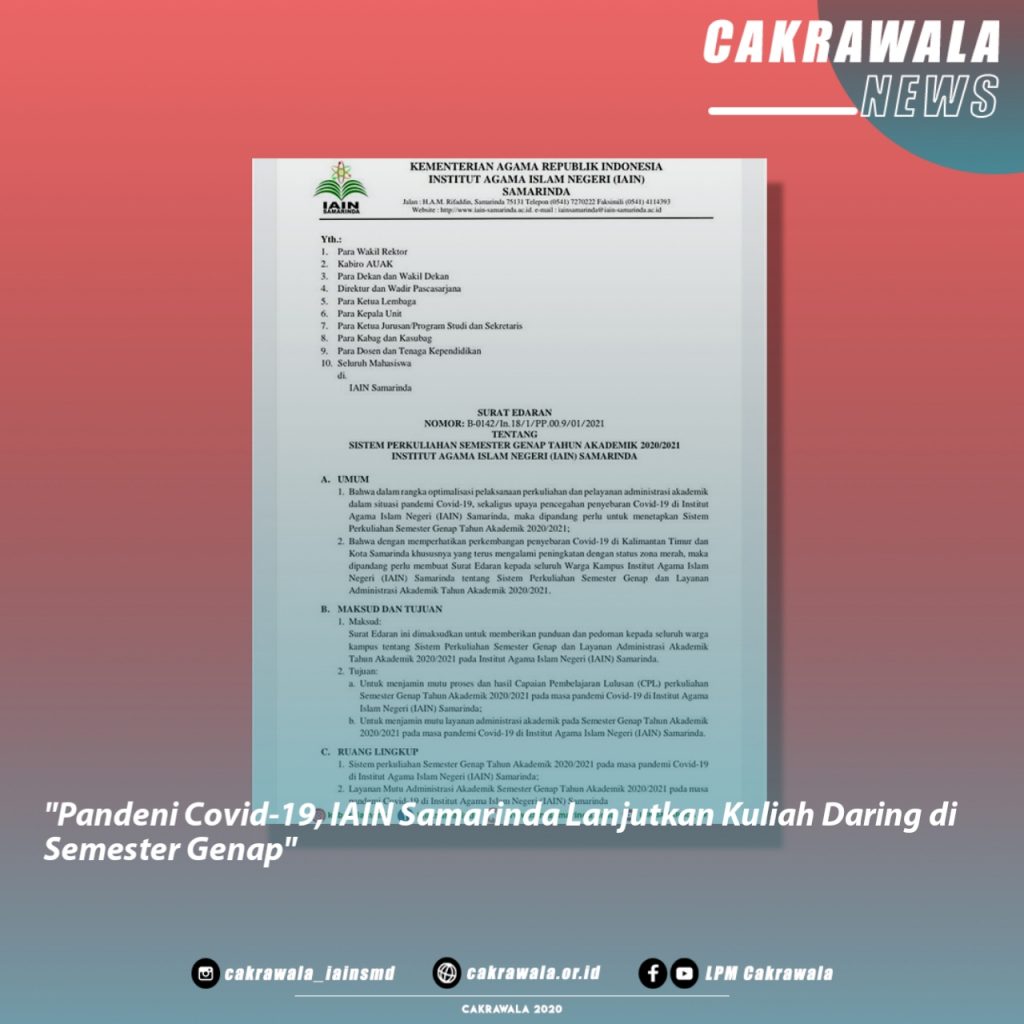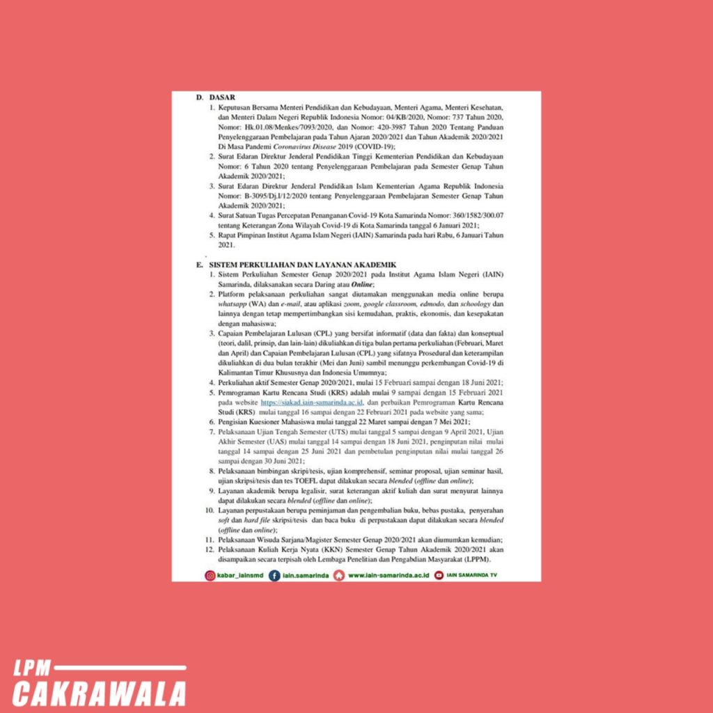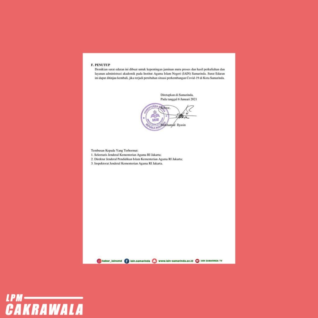 Samarinda, LPM Cakrawala – Institut Agama Islam Negeri (IAIN) Samarinda akan melanjutkan perkuliahan secara daring (online) pada semester genap tahun akademik 2020/2021. Keputusan ini di keluarkan oleh pihak rektorat melalui Surat edaran Nomor: B-0142/In.8/1/PP.00.9/01/2021 tentang sistem perkuliahan semester genap tahun akademik 2020/2021 Institut Agama Islam Negeri (IAIN) Samarinda.