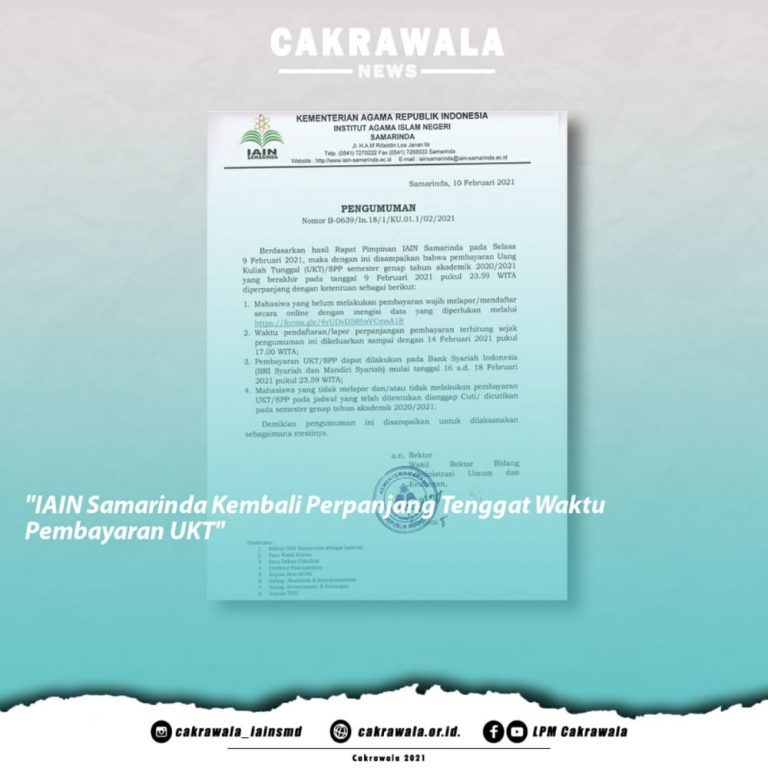 Samarinda, LPM Cakrawala- Institut Agama Islam Negeri (IAIN) Samarinda kembali memperpanjang batas waktu pembayaran Uang Kuliah Tunggal (UKT) dari tanggal...
