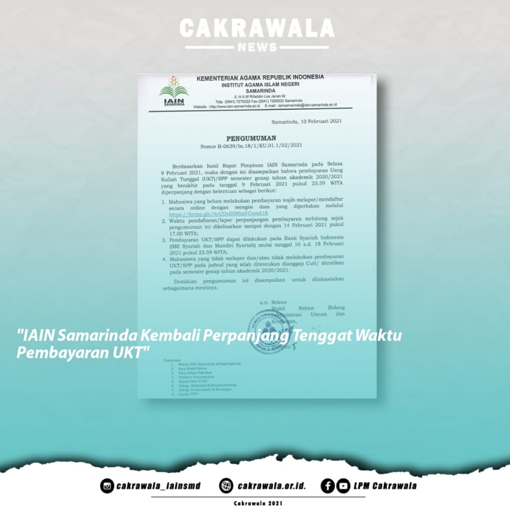 Meninjau dari Surat Edaran Rektor Nomor: B-0639/In.18/1/KU.01.1/02/2021 tentang Perpanjangan Pembayaran UKT/SPP Semester Genap 2020/2021. Dalam surat edaran tersebut tertera hasil Rapat Pimpinan IAIN Samarinda pada Selasa (9/2), disebutkan bahwa pembayaran UKT/SPP semester genap akan kembali diperpanjang selama tiga hari mulai 16 hingga 18 Februari 2021. Bagi mahasiswa yang belum melakukan pembayaran, wajib melapor atau mendaftar secara online dengan mengisi data sampai dengan tanggal 14 Februari 2021 melalui laman web https://forms.gle/4yUDvD5RbsVCmsA18.