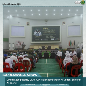 Samarinda, LPM Cakrawala – Unit Kegiatan Mahasiswa (UKM) Jami’iyyatul Qurra’ Wal Huffadzh (JQH) mengadakan pembukaan Musabaqah Tilawatil Qur’an (MTQ) dan Semarak Al-Qur’an ke-IV se-kota Samarinda pada Selasa, (23/08/2022).
