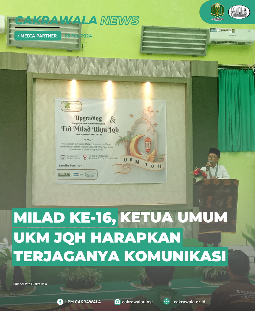 Samarinda, LPM Cakrawala – Unit Kegiatan Mahasiswa (UKM) Jami’atul Qurro’ wal Hufaz (JQH) telah sukses merayakan milad ke-16 pada Sabtu, (24/02), di gedung serbaguna UINSI Samarinda.