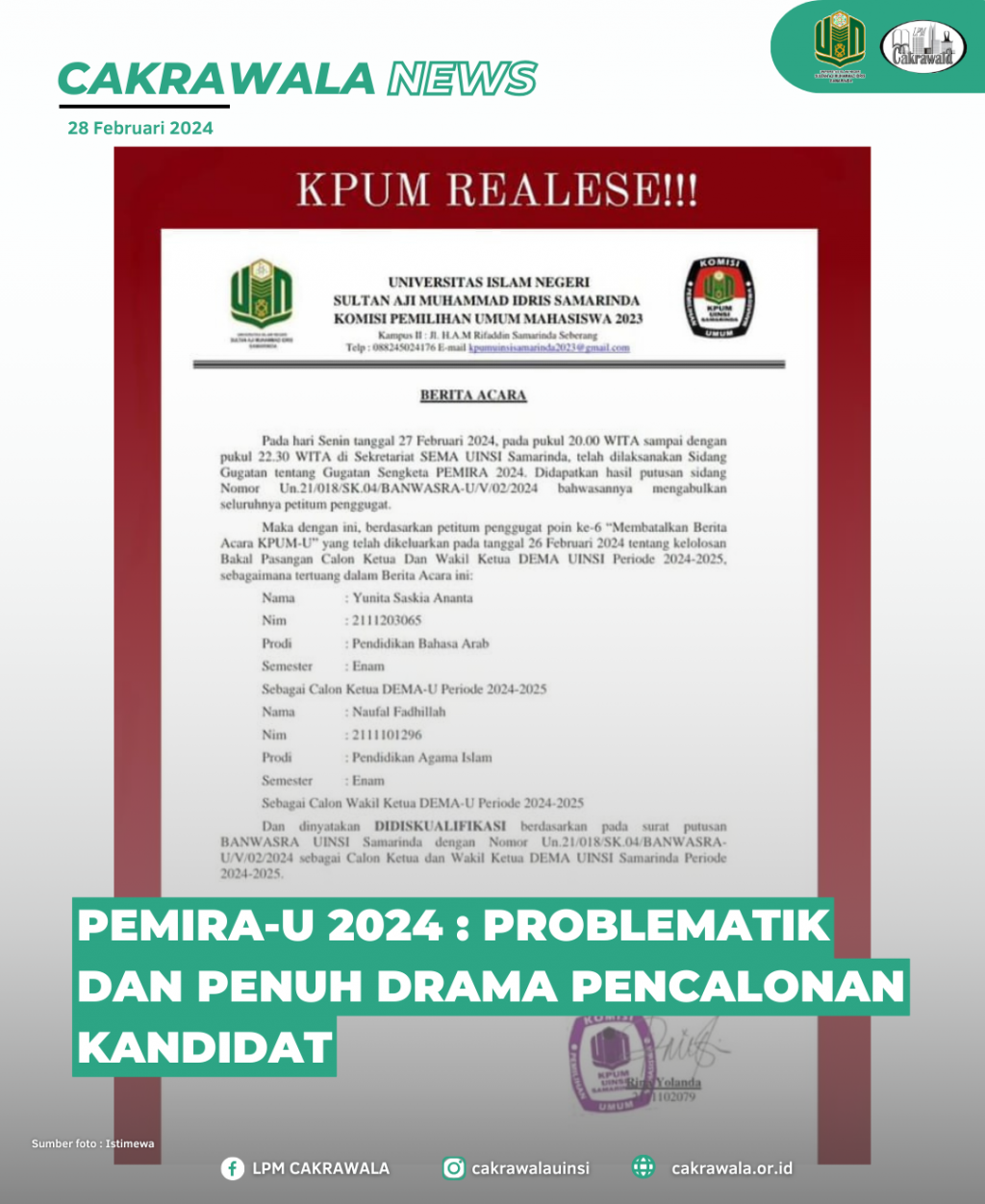Samarinda, LPM Cakrawala – Penyelenggaran Pemilihan Raya (Pemira) Universitas Islam Negeri Sultan Aji Muhammad Idris (UINSI) Samarinda kembali menjadi perbincangan hangat setelah terjadi kekosongan Calon Kandidat Ketua-Wakil Ketua Dewan Eksekutif Mahasiswa Universitas (Dema-U) yang kesekian kalinya. Hal tersebut mengejutkan seluruh elemen kampus pasca didiskualifikasi Pasangan Calon Kandidat Ketua-Wakil Ketua Dema-U atas nama Yunita Saskia Ananta dan Naufal Fadhillah pada Selasa, (27/02).
