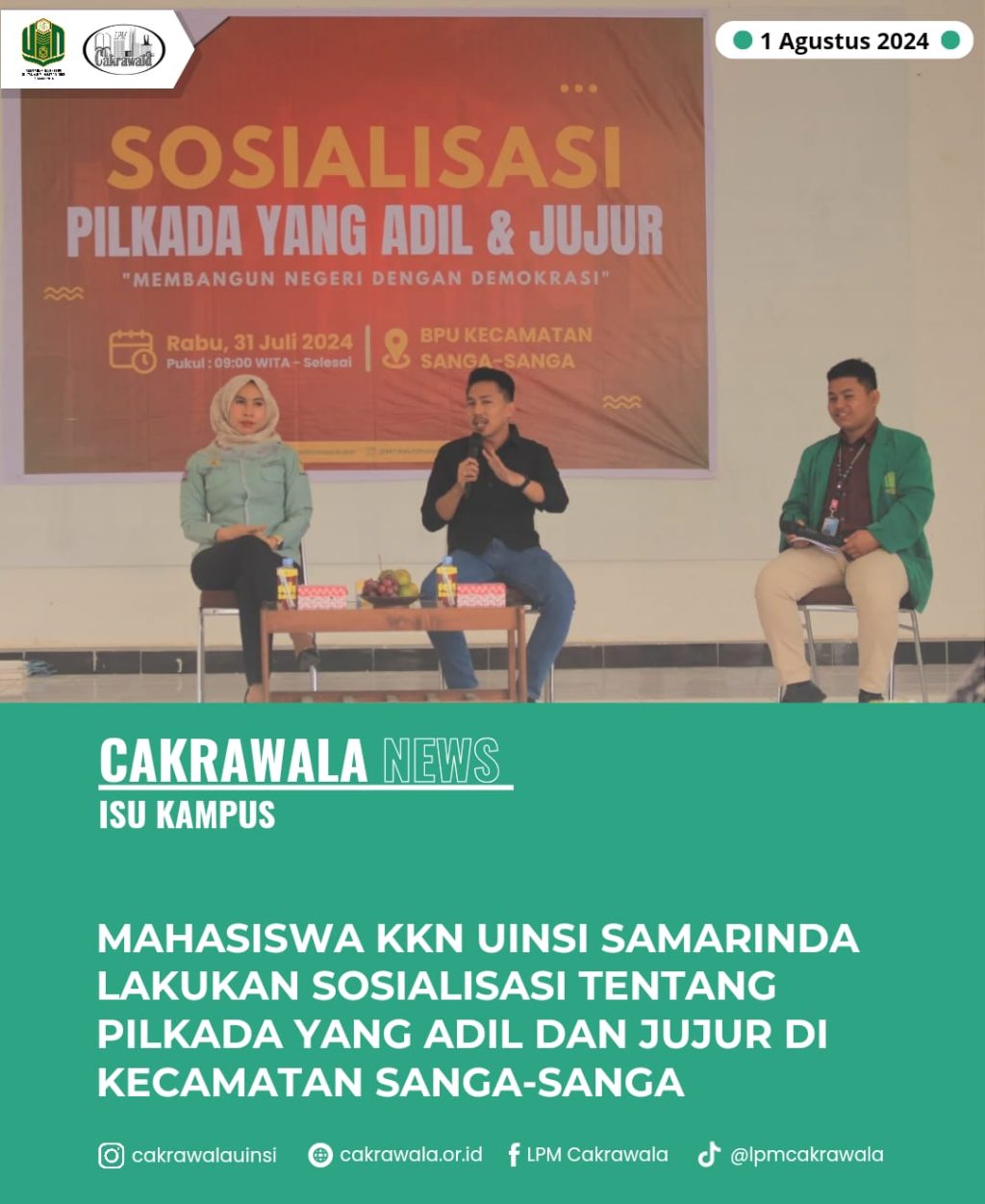 Tidak hanya itu, kegiatan ini juga dilaksanakan bukan hanya untuk Kelurahan Jawa saja, para mahasiswa KKN ini langsung melaksanakan untuk se-Kecamatan Sanga-Sanga pada Rabu, (31/07) di Balai Pertemuan Umum (BPU) Kecamatan Sanga-Sanga, Kutai Kartanegara. Menghadirkan Narasumber dari Anggota Panwascam Sanga-Sanga, Imelda Hasibuan, S.H, M.H. dan Founder Pemuda Batuah Bersatu, Muhammad Hasbi, S.Sos, M.Ap.