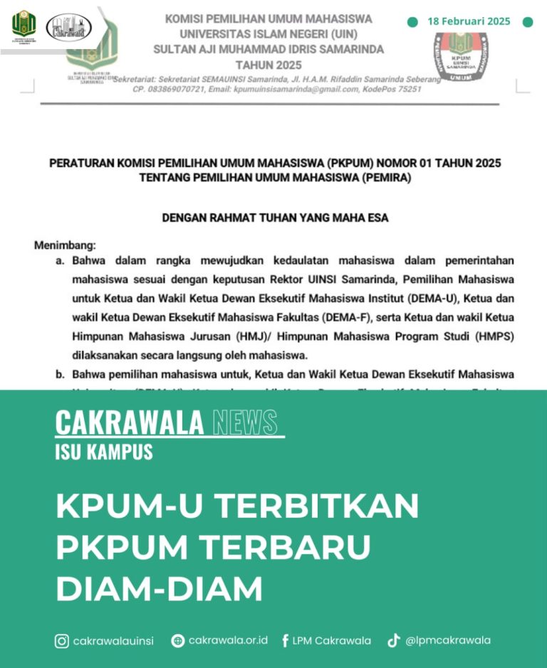 Samarinda, LPM Cakrawala — Komisi Pemilihan Umum Mahasiswa Universitas (KPUM-U) telah mengeluarkan Peraturan Komisi Pemilihan Umum Mahasiswa (PKPUM) terbaru pada...