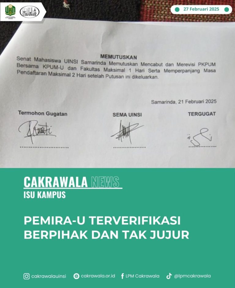 Samarinda, LPM Cakrawala - Pemilihan Umum Raya Universitas (Pemira-U) dipastikan mengalami kemunduran dan tidak jadi terlaksana sesuai dengan surat edaran...
