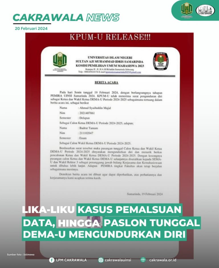 Samarinda, LPM Cakrawala- Wakil Ketua yang saat ini beralih status menjadi Pelaksana Tugas (PLT) diduga akan menggantikan posisi Ketua untuk...