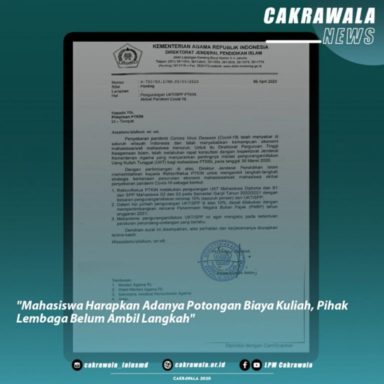 Samarinda, LPM Cakrawala - Kementerian Agama Republik Indonesia telah mengeluarkan surat edaran terkait pengurangan UKT/SPP PTKIN Akibat Pandemi Covid-19, Senin...